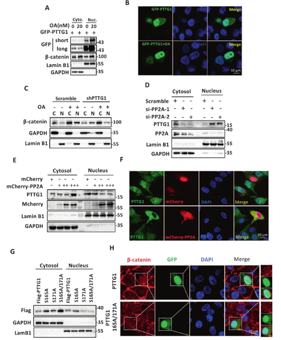 此外,该团队发现PTTG1在其S161、S171位点具有磷酸化修饰,而且PTTG1蛋白的亚细胞定位依赖于其自身的磷酸化状态。即磷酸化的PTTG1更容易转位到细胞核,反之亦然。该团队进一步筛选并证明了磷酸酶PP2A可以对PPTG1-S165、S171位点进行去磷酸化作用,抑制PTTG1的核累积。更重要的是,磷酸化的PTTG1能够同时增强β-catenin蛋白进入细胞核的能力,进而促进其与TCF4的结合,导致Wnt通路靶基因的激活。