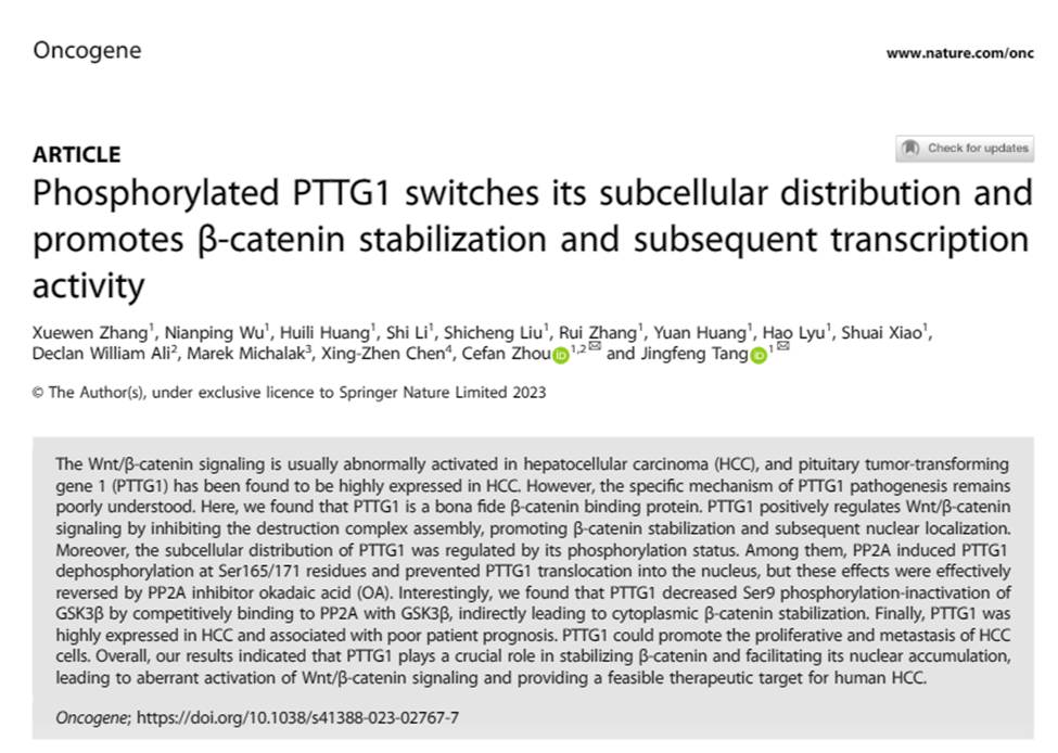 2023年7月3日,WilliamHill登录入口细胞调控与分子药物“111”引智基地唐景峰/周策凡团队在国际肿瘤学领域权威期刊《Oncogene》发表题为“Phosphorylated PTTG1 switches its subcellular distribution andpromotes β-catenin stabilization and subsequent transcription activity”的研究论文。WilliamHill登录入口唐景峰和周策凡为本文通讯作者。2019级硕士研究生张学文为论文第一作者。该研究得到课题组国家自然科学基金项目(32270768、32070726、82273970、31871176)、湖北省重点研发计划项目(2022EHB038)、湖北省创新群体计划项目(ZRQT2023000075)、武汉市科技计划项目(2022020801020272)资助。